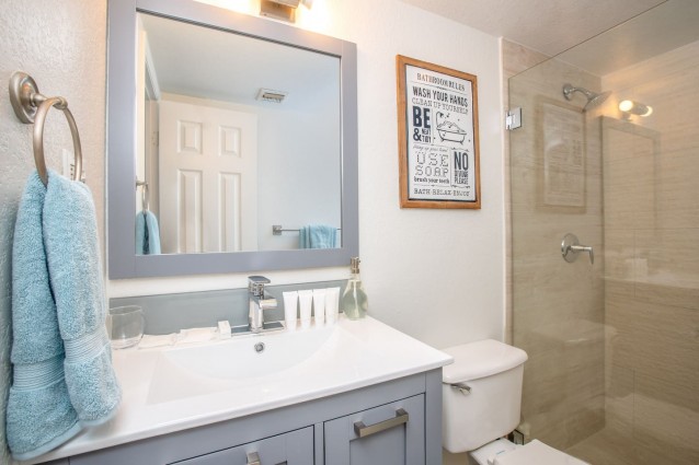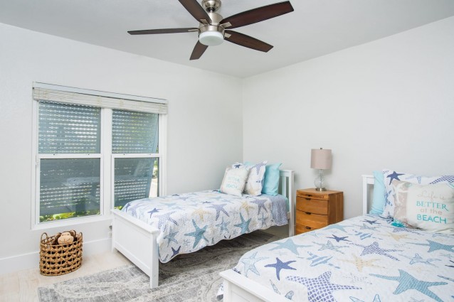 You will have access to the beach and the back patio through the glass sliding doors. The master has a queen bed with a breath-taking view of the property's personal beach and its own bathroom with a walk-in shower. The Second bedroom has two twin beds and matching furnishings, and its own bathroom with a walk-in shower. You can soak in the tranquility and sounds of the waves crashing on the shore as you dine on the screened in back patio. This design of this condo was intentionally curated to emanate tranquility throughout.