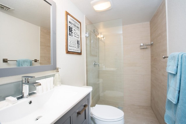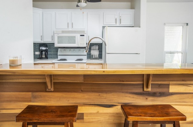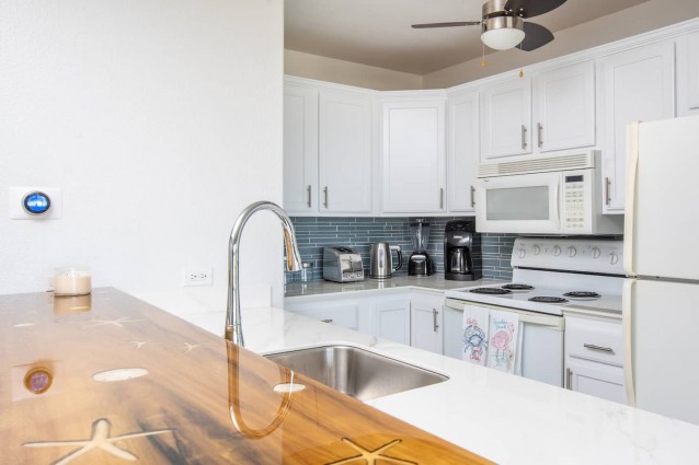 The entire condo is newly renovated with our own unique touch to give our guests an authentic and luxurious island vibe. The living/kitchen area is an open floor plan with a comfortable L shaped sectional with a pull out bed and all new furnishings. The kitchen countertop was mindfully crafted by the owner himself, fully stocked with all of the essential cookware.