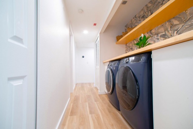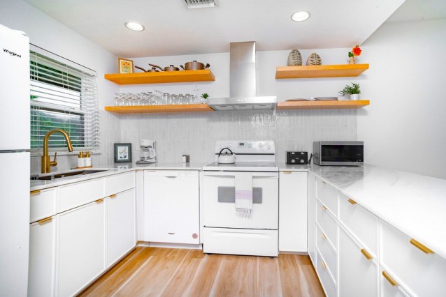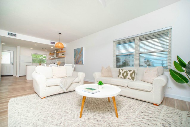 The modern kitchen is fully equipped with quality appliances, generous storage, and ample prep space — ideal for both casual meals and entertaining. The living area is spacious and comfortable, with sliding doors that invite in the sea breeze and natural light.