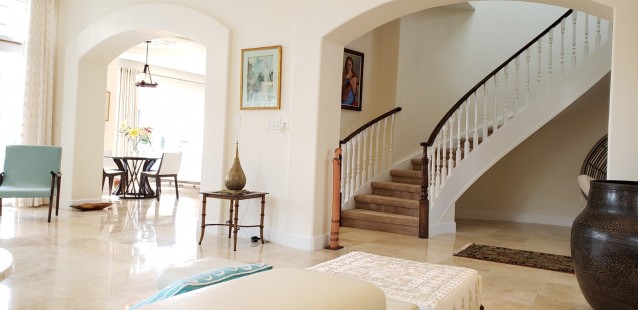 Whether it be from the balconies upstairs or the several rooms downstairs, you can open up the doors to the sweeping views of the Britannia Golf course and enjoy the sounds of the Caribbean breeze blowing across the lush grounds.