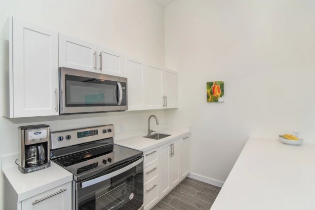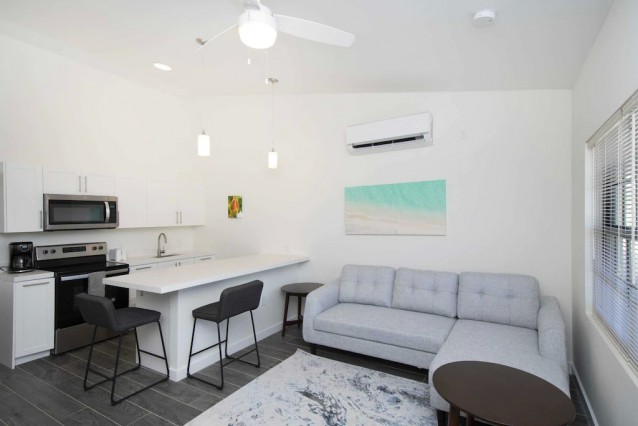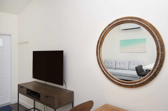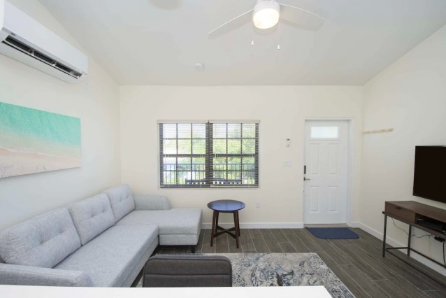 This cozy one-bedroom apartment is the perfect island getaway. The interior is bright and airy, with an open plan living and dining area that flows into the fully equipped kitchen. The bedroom features a comfortable queen-sized bed and a private balcony. The bathroom is sleek and modern, with a bathtub and shower with luxurious fixtures.